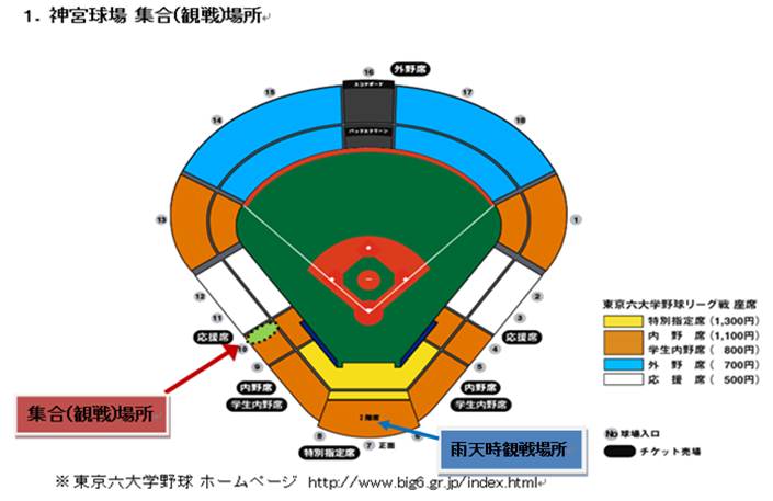 ※雨天時は、集合/観戦を屋根のあるバックネット裏2階席とします。当日朝の天候で判断します。